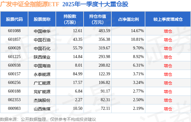 从基金规模来看,广发中证全指能源ETF基金2025年一季度公布的基金规模为0.33亿元,较上一期规模3425.58万元变化了-128.87万元星火配资,环比变化了-3.76%。该基金最新一期资产配置为:股票占净值比98.67%,无债券类资产,现金占净值比2.34%。从基金持仓来看,该基金当季前十大股票仓位达64.82%,第一大重仓股为中国神华(601088),持仓占比为14.67%。
