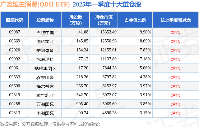 从基金规模来看华泰优配,广发恒生消费(QDII-ETF)基金2025年一季度公布的基金规模为15.51亿元,较上一期规模4.71亿元变化了10.8亿元,环比变化了229.38%。该基金最新一期资产配置为:股票占净值比97.42%,无债券类资产,现金占净值比2.59%。从基金持仓来看,该基金当季前十大股票仓位达57.32%,第一大重仓股为百胜中国(09987),持仓占比为9.9%。